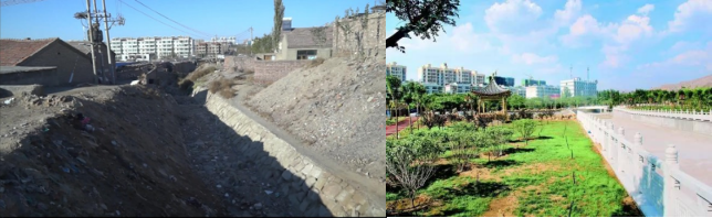 左1黑砂河治理前 右1黑砂河治理后