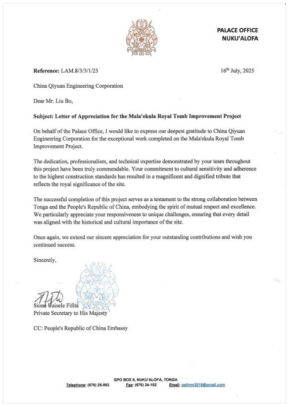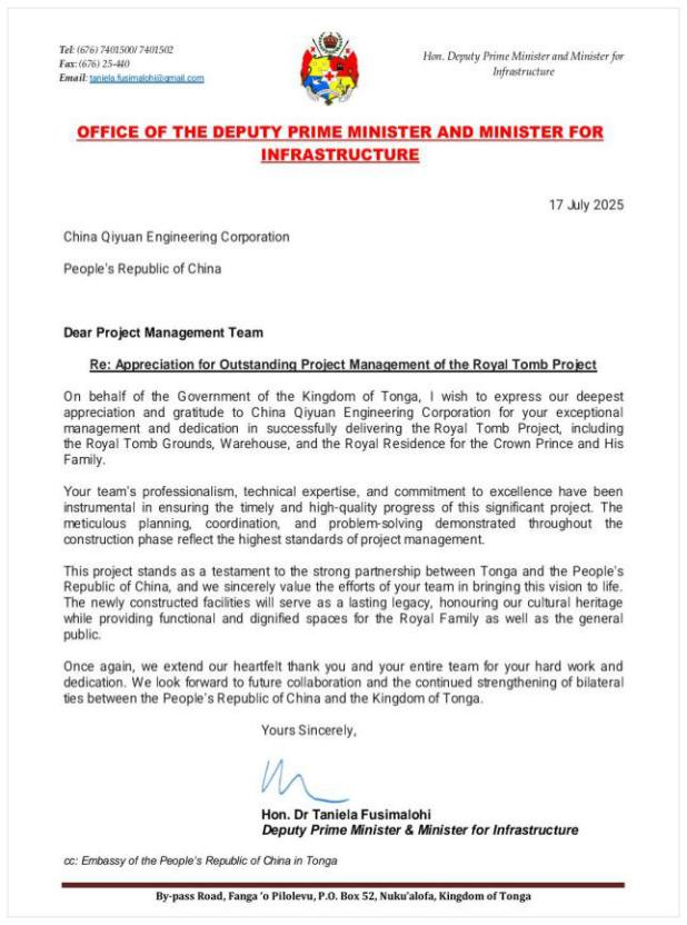 汤加副首相兼基础设施部大臣的感谢信 信中一致表示,中国启源项目团队遵循最高建设标准,在建设过程中展现出了专业态度和技术实力,项目的顺利进行,充分诠释了项目团队的卓越管理和奉献精神,让文化遗产绽放光彩。
